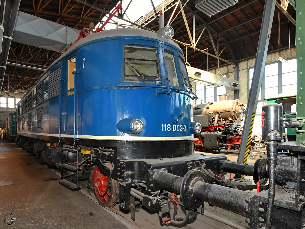 Die Elektrolokomotive 118 003-3 im August 2018 im Eisenbahnmuseum Koblenz.