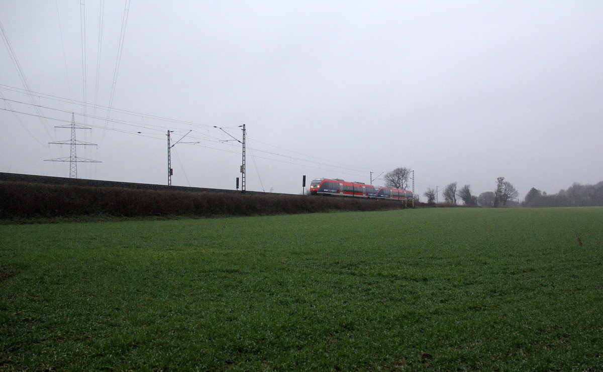 Ein Bilck auf den RE4 von Aachen-Hbf nach Dortmund-Hbf unterwegs ist zwischen Kohlscheid und Richterich. Aufgenommen zwischen Aachen und Kohlscheid in Uersfeld,Richterich. Bei Regenwetter am Kalten Nachmittag vom 7.1.2019.
