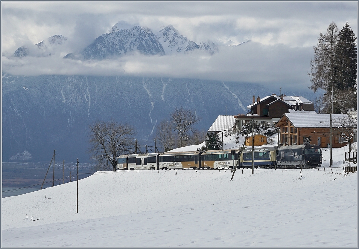 Die MOB Ge 4/4 8003 erreicht mit ihrem MOB Panroramic Express IR 2122 in Kürze Les Avants. 3. Feb. 2018