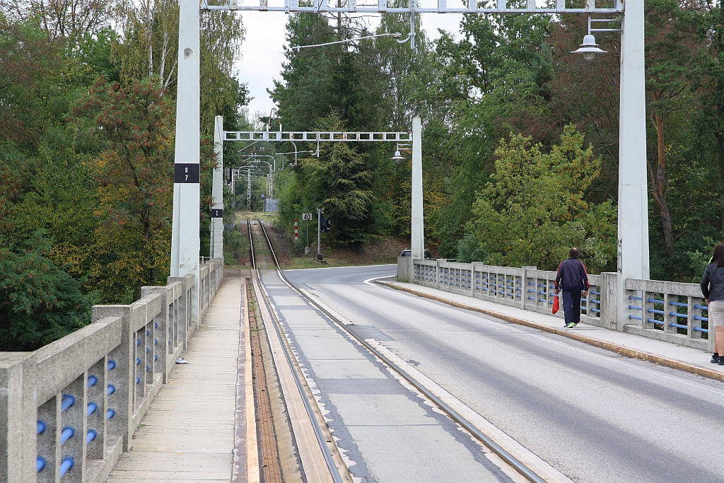 Im Strecken-km 23,5 der Strecke Tabor - Bechyne befindet sich die 1928 fertiggestellte, 203,28m lange und 50m hohe, kombinierte Eisenbahn- und Straßenbrücke über die Luznice (Lainsitz). Die Brücke hat seit 2014 den Status eines Nationalen Kulturdenkmals der Tschechischen Republik. Bild vom 25.August 2018.