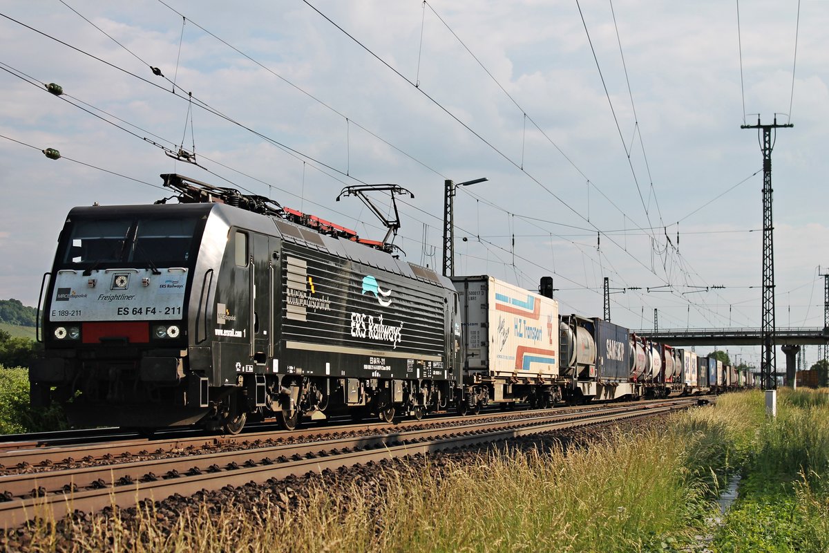 Mit einem Containerzug nach Holland war am Abend des 02.06.2017 die MRCE/SBBCI ES 64 F4-211 (189 211-6) "ERS Railways" unterwegs durchs Rheintal, als sie bei Müllheim (Baden) gen Freiburg (Breisgau) fuhr.