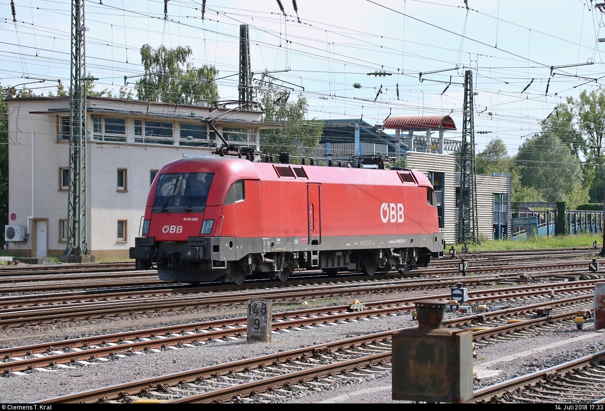 Nachschuss auf 1016 026-7 (Siemens ES64U2) ÖBB, die im Bahnhof Singen(Hohentwiel) vor dem elektromechanischen Stellwerk Sf des Fahrdienstleiters (Fdl) rangiert. Aufgenommen am Ende des Bahnsteigs 1. [14.7.2018 | 17:33 Uhr]