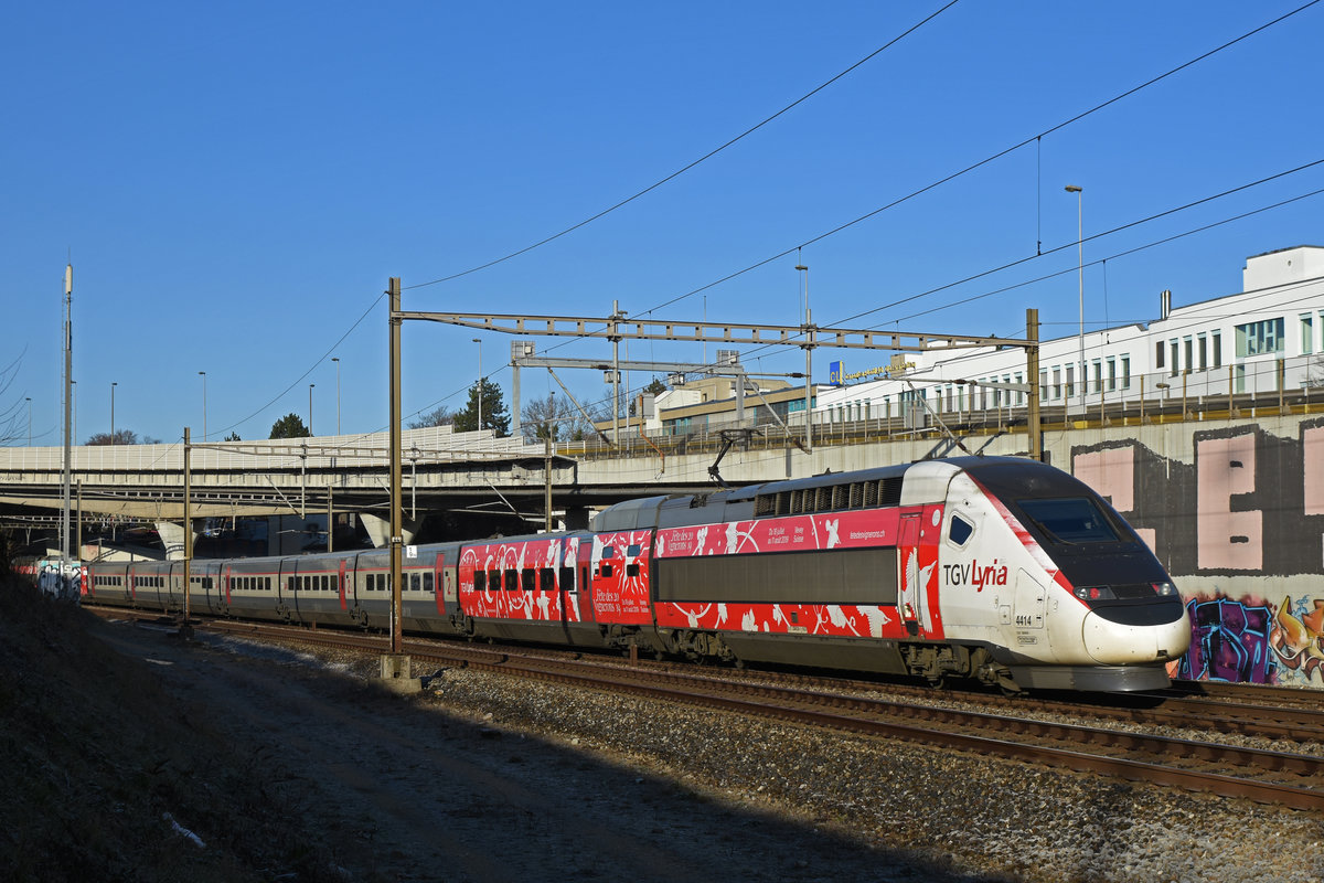 TGV Lyria 4414 mit der Werbung für das Fete des Vignerons, fährt Richtung Bahnhof SBB. Die Aufnahme stammt vom 03.01.2019.