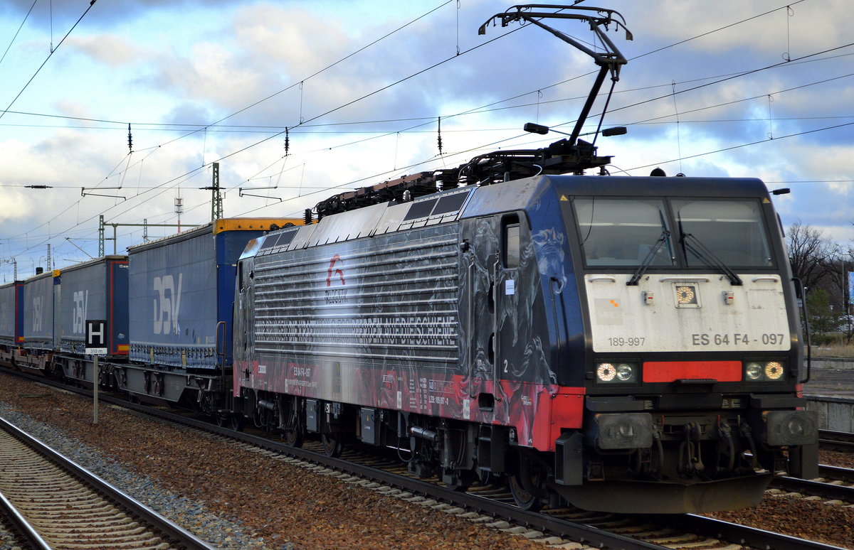TX Logistik AG mit der schön gestalteten MRCE  ES 64 F4-097  [NVR-Number: 91 80 6189 997-0 D-DISPO] und KLV-Zug aus Rostock am 10.01.19 Bf. Flughafen Berlin-Schönefeld.