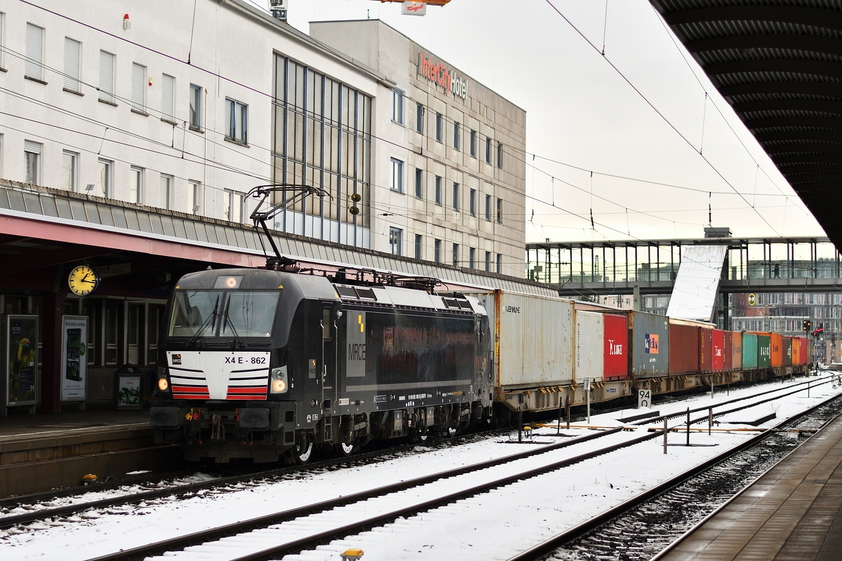 193 862 fuhr am 12. Januar 2018 mit einem Containerzug durch Ulm Hbf nach Beimerstetten.