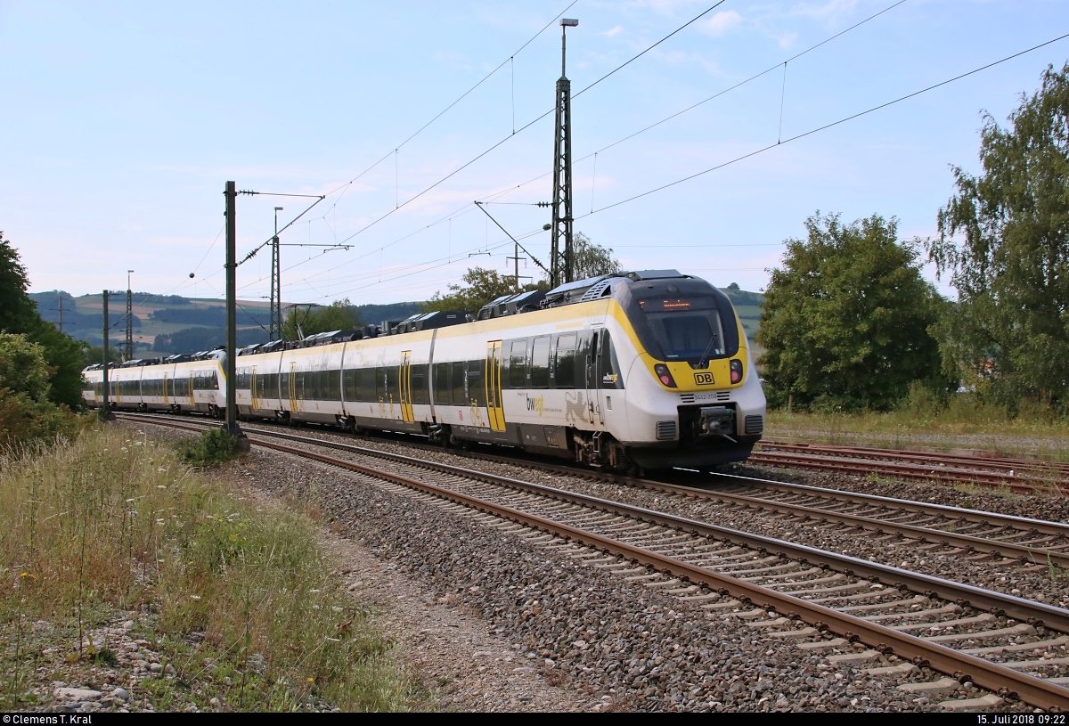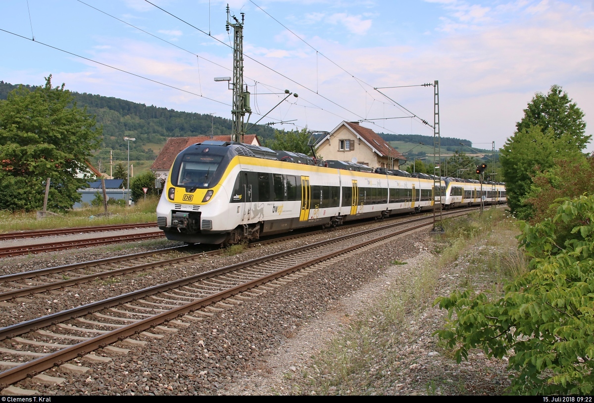 3442 710 und 3442 208 (Bombardier Talent 2) von DB Regio Baden-Württemberg als verspäteter RE 4775 von Stuttgart Hbf nach Konstanz durchfahren den Bahnhof Welschingen-Neuhausen auf der Bahnstrecke Offenburg–Singen (Schwarzwaldbahn (Baden) | KBS 720).