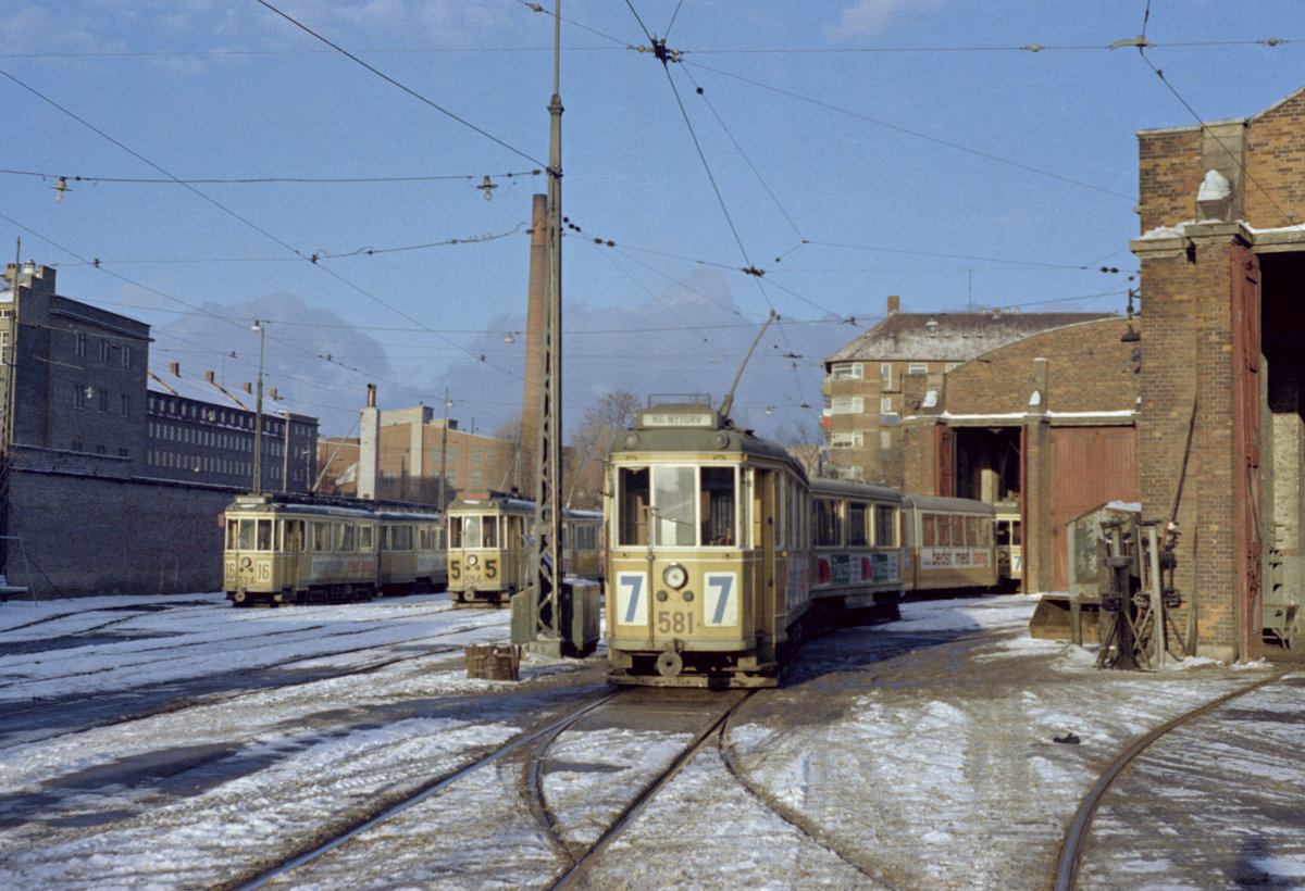 København / Kopenhagen Københavns Sporveje: Nach der Stillegung der SL 2 im Oktober 1969 gab es nur noch drei Straßenbahnlinien in Kopenhagen, die alle auf diesem Bild vertreten sind, nämlich 5, 7 und 16. - Am 2. Januar 1970 stehen u.a. die Drehgestellgarnituren 581 + 15** als SL 7 (im Vordergrund), 594 + 15** als SL 5 und 524 + 15** als SL 16 (beide Züge im Hintergrund) im Straßenbahnbetriebsbahnhof Nørrebro. - Scan eines Farbnegativs. Film: Kodak Kodacolor X.