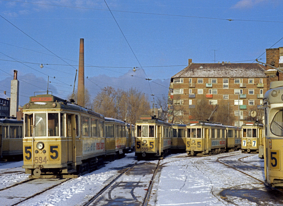 København / Kopenhagen Københavns Sporveje: Am 2. Januar 1970 standen im Straßenbahnbetriebsbahnhof Nørrebro u.a. drei Drehgestellgarnituren als SL 5 (die Tw 594, 595 und 573 mit ihren Beiwagen) samt dem Tw 538 als SL 7. - Scan eines Farbnegativs. Film: Kodak Kodacolor.