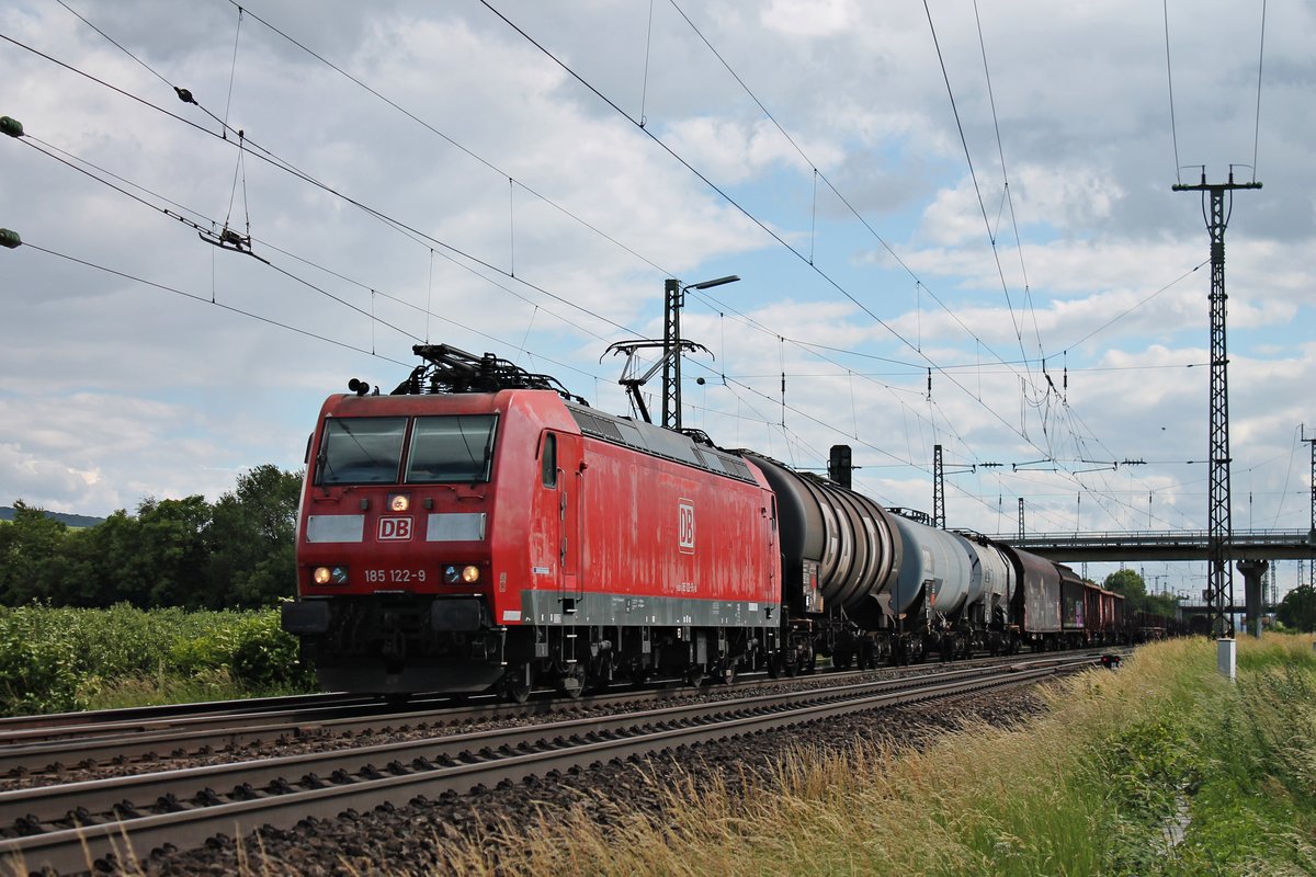 Mit einem gemischten Güterzug (Chiasso Smistamento - Mannheim Rbf) fuhr am 06.06.2017 die 185 122-9 nördlich von Müllheim (Baden) durchs Rheintal gen Norden.
