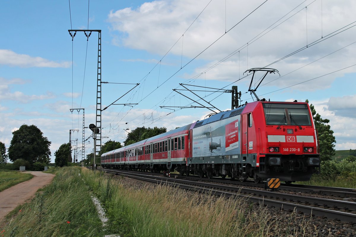 Nachschuss am 06.06.2017 auf 146 230-8 "Radolfzell feiert 750 Jahre Stadtrecht", welche ihre RB nach Offenburg bei Müllheim (Baden) in Richtung Buggingen schob.