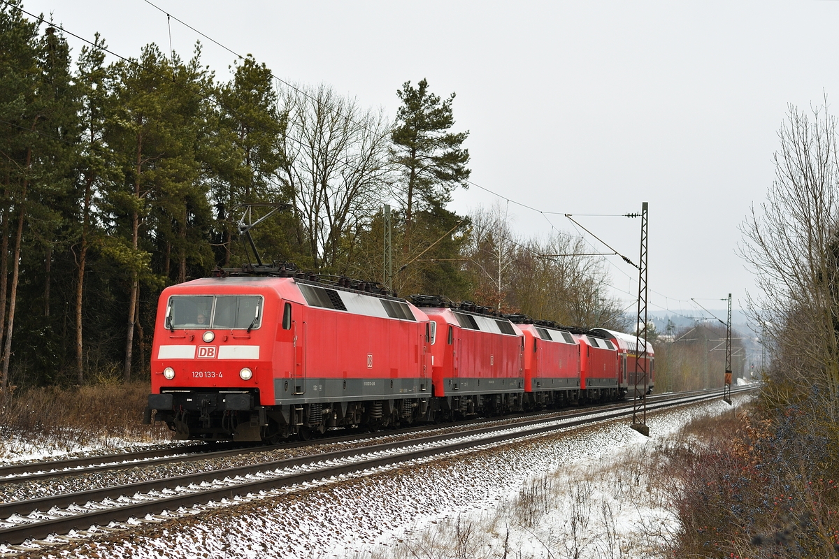 PbZ 2461 bestand am 4. Januar 2019 aus vier 120 und einem Dosto. Führende Lok war 120 133. Aufgenommen wurde der Zug bei Westerstetten.