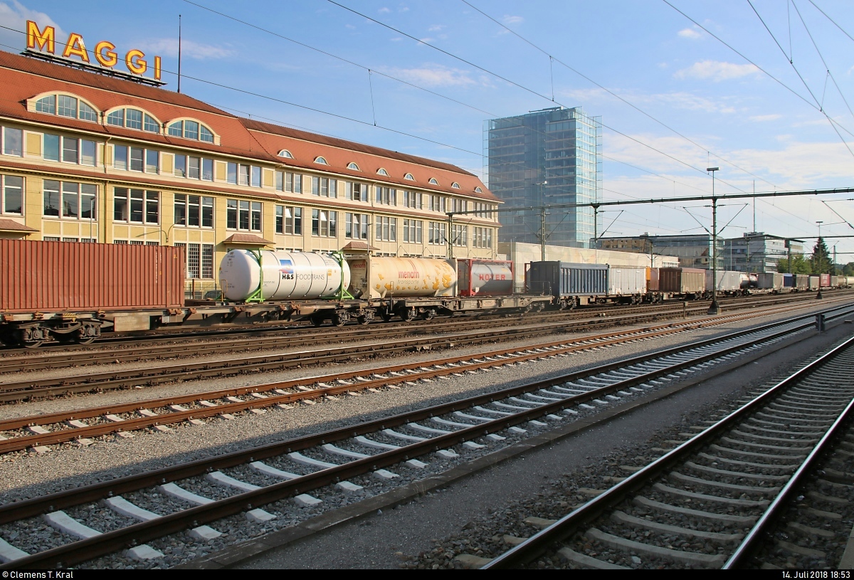 Zahlreiche Flachwagen der Hupac AG mit (Kessel-)Containern sind im Bahnhof Singen(Hohentwiel) vor dem MAGGI-Werk abgestellt.