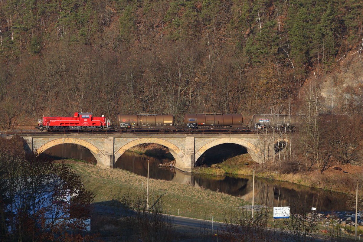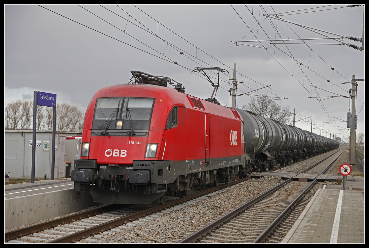 1116 132 fährt am 14.01.2019 mit einem Güterzug durch die Haltestelle Tallesbrunn.