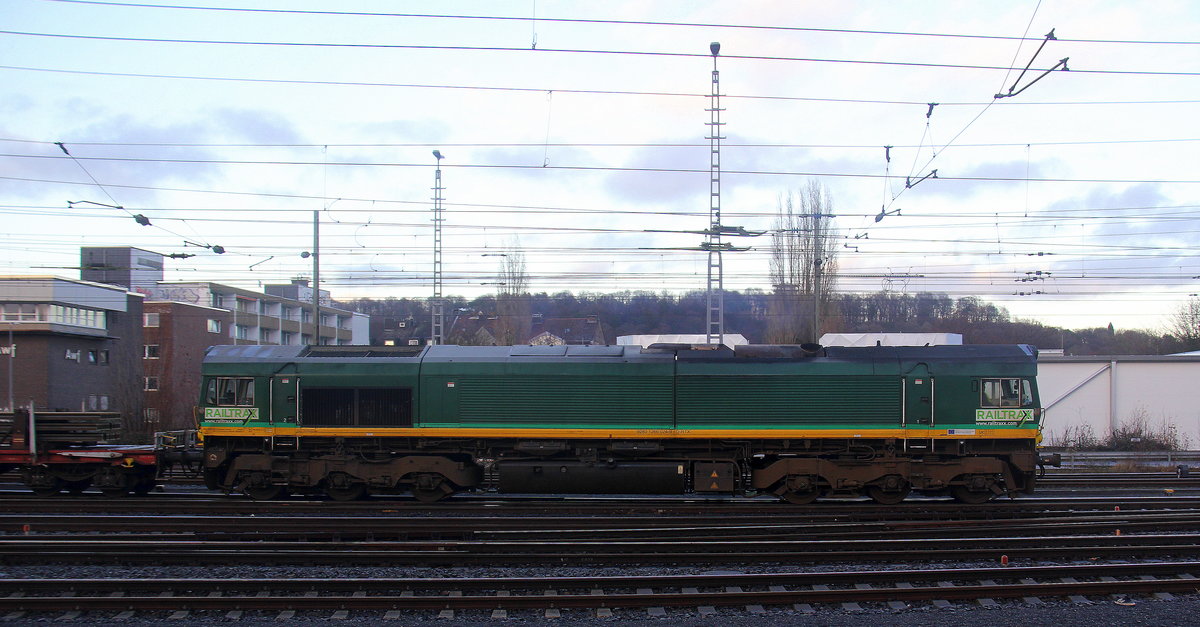 Die Class 66 266 024-9 von Railtraxx fährt mit viel Dieselpower mit einem Schinenzug aus Österreich nach Belgien bei der Ausfahrt aus Aachen-West in Richtung Montzen/Belgien. Aufgenommen vom Bahnsteig in Aachen-West. Bei Sonne und Wolken am Kalten Nachmittag vom 14.1.2019.