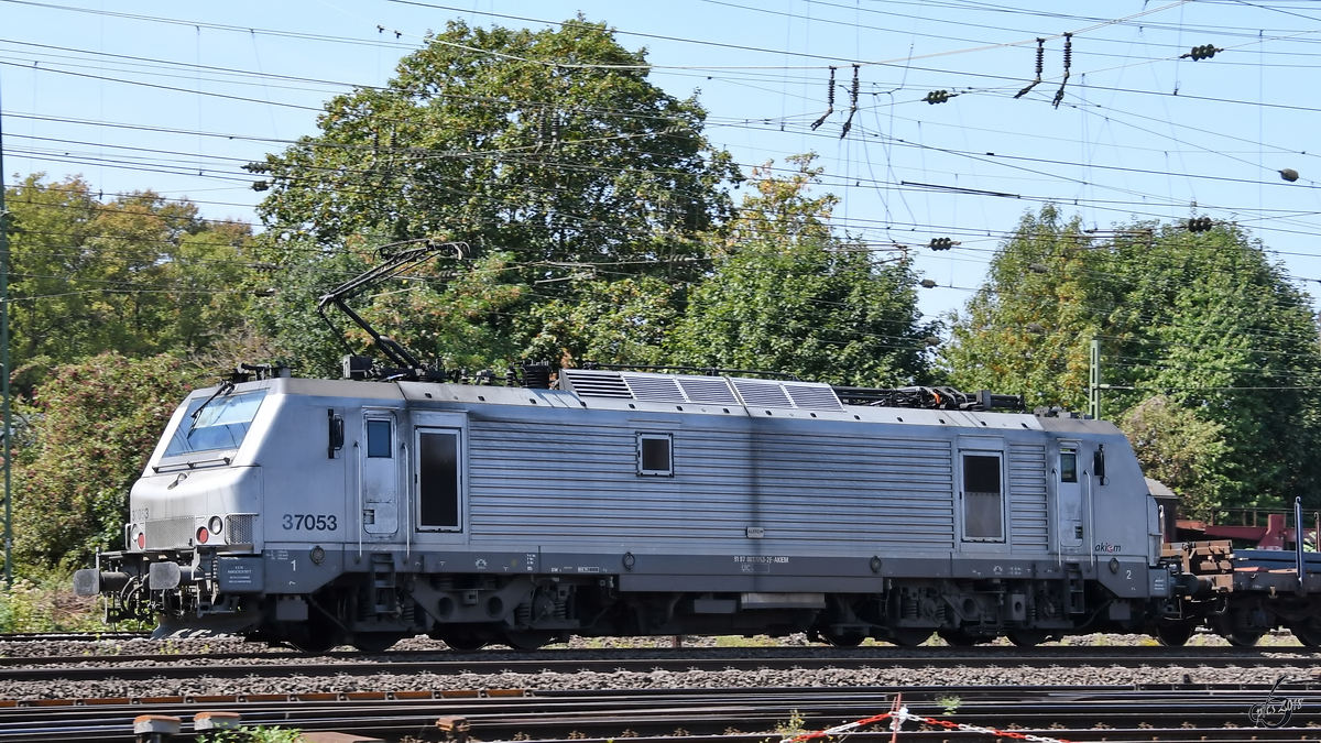 Die Elektrolokomotive 37053 huscht mit einem Güterzug vorbei. (Koblenz, August 2018)