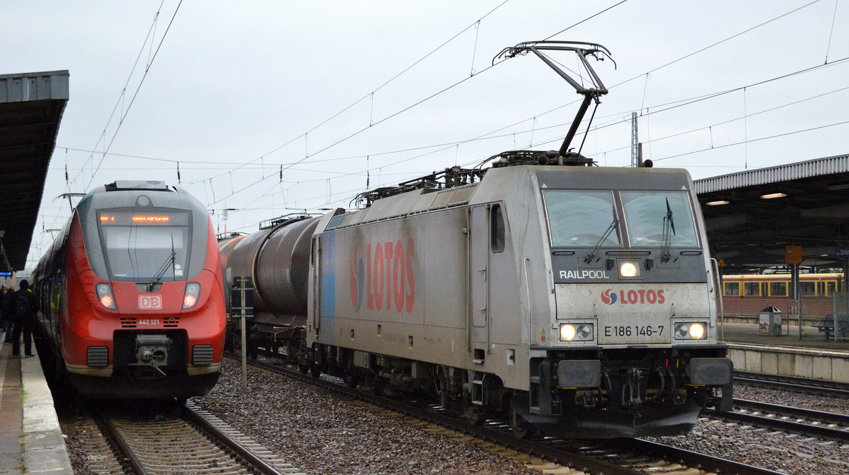 Die polnische Fa. Lotos Kolej Sp. z o.o mit der Rpool   E 186 146-7  [NVR-Number: 91 80 6186 146-7 D-Rpool] und Kesselwagenzug (Dieselkraftstoff) am 15.01.19 Durchfahrt Bf. Flughafen Berlin-Schönefeld.