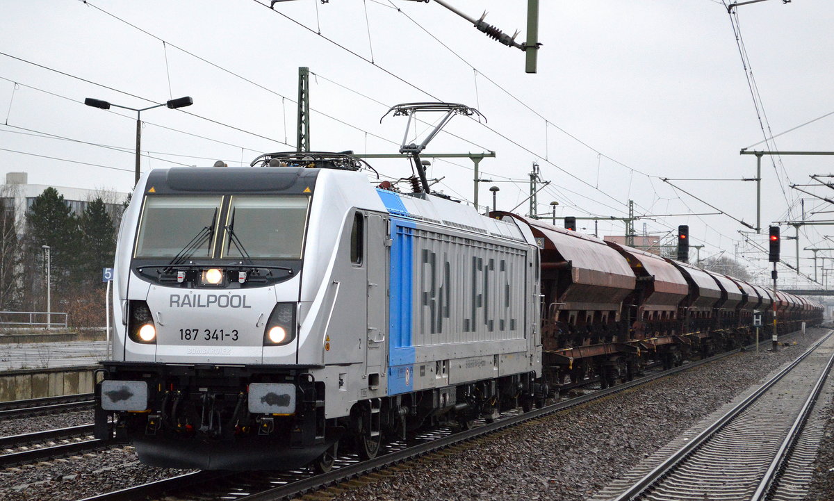 Eine fast noch fabrikfrische Rpool 187ér die "187 341-3" [NVR-Number: 91 80 6187 341-3 D-Rpool] bringt einem Ganzzug DB Schüttgutwagen mit Schwenkdach zum Durchfahrtgleis im Bf. Flughafen Berlin-Schönefeld und wird abgehakt und fährt zu neuen Aufgaben, ca. einen Stunde später übernahm die am Rande des Bhf. abgestellte 482 040-3 den Güterzug die wohl nachwievor für HSL im Einsatz ist, 15.01.19
