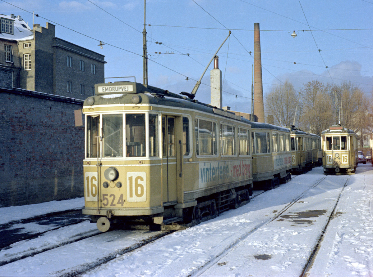 København / Kopenhagen Københavns Sporveje SL 16: Am 2. Januar 1970 hält u.a. der Tw 524 mit dem Bw 15** im Straßenbahnbetriebsbahnhof Nørrebro. - Scan eines Farbnegativs. Film: Kodak Kodacolor X.