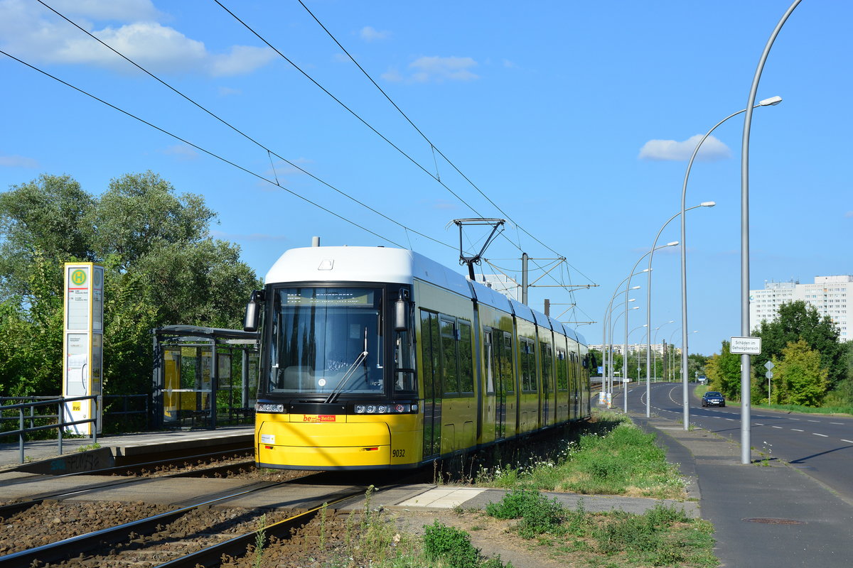 Triebzug 9932 Typ F8Z 11 fährt an der Haltestelle Gewerbegebiet Georg Knorr aus. Rechts sieht man die für Marzahn typischen Plattenbauten. Berlin Marzahn 23.07.2018