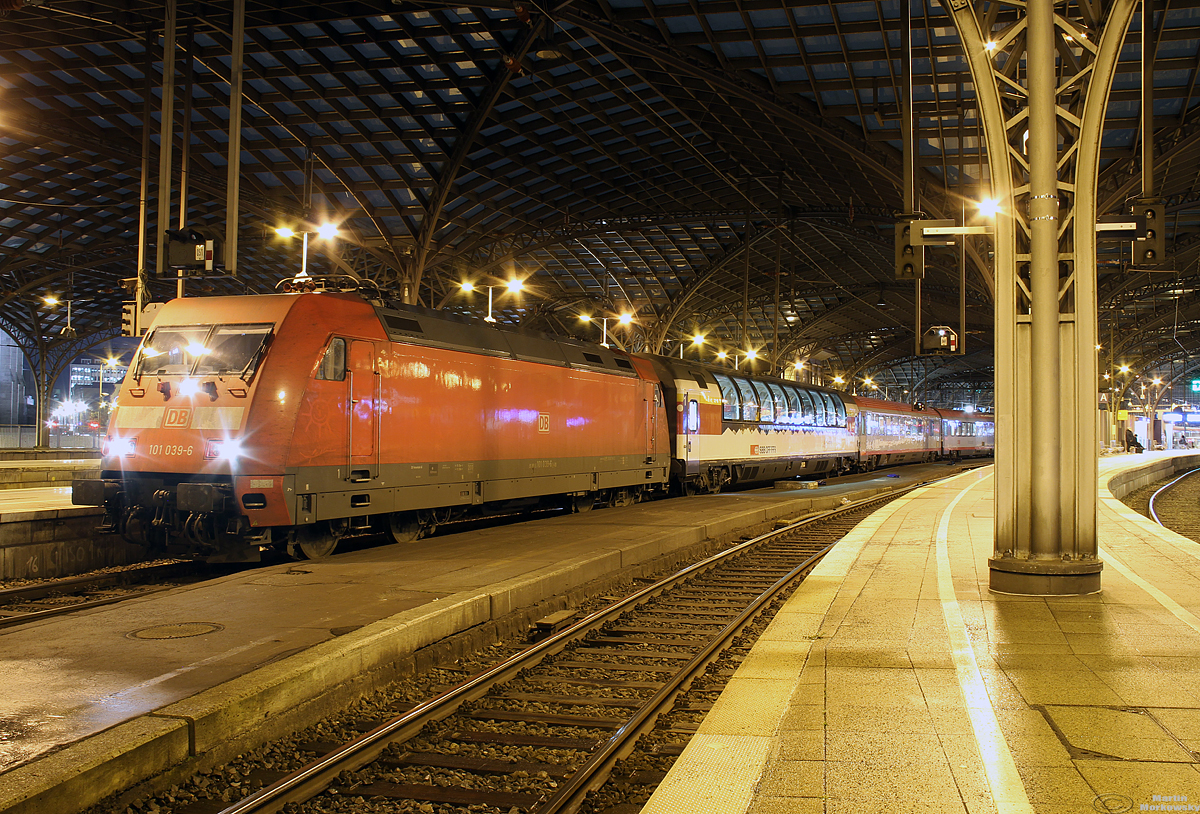 101 039 am IC118 mit dem Park des EC163/164 in Köln Hbf am 17.01.2018