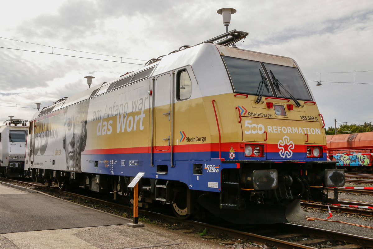 Hier die Werbelok DB Cargo be mit Werbung für einen Job als Lokführer,