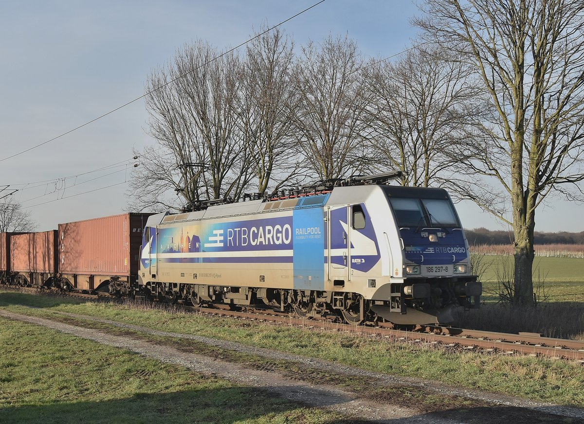 186 297-8 der RTBC kommt aus Boisheim gen Dülken am Nachmittag des heutigen Samstag den 19 Januar 2019 vorüber gefahren.