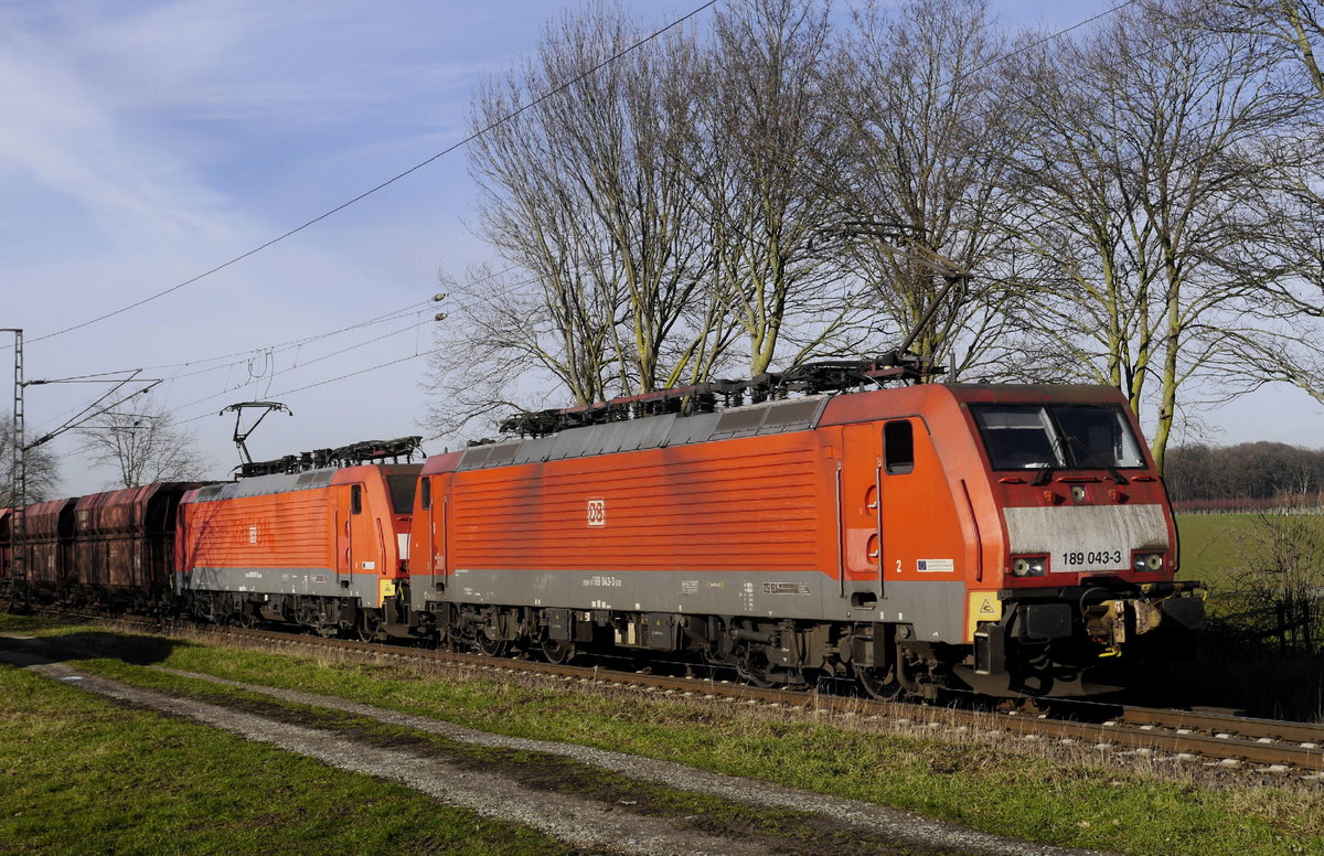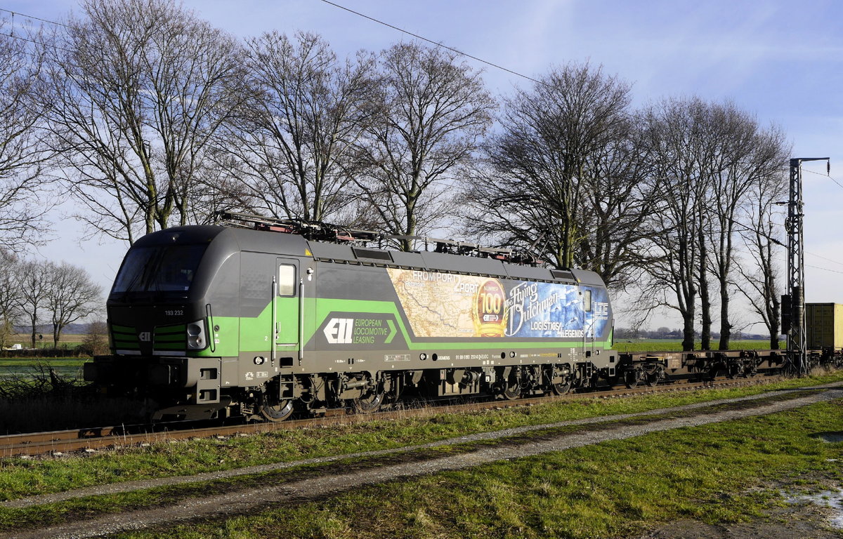 193 232 "Flying Dutchman" auf Umleiterkurs bei Boisheim, 19.1.19. Auch der Fliegende Holländer musste sich den Gegebenheiten der eingleisigen Strecke anpassen. Von "fliegend" war keine Rede; die Einfahrt nach Boisheim stand auf Hp2. Eine Begegnung sorgte für eine Zwangspause.