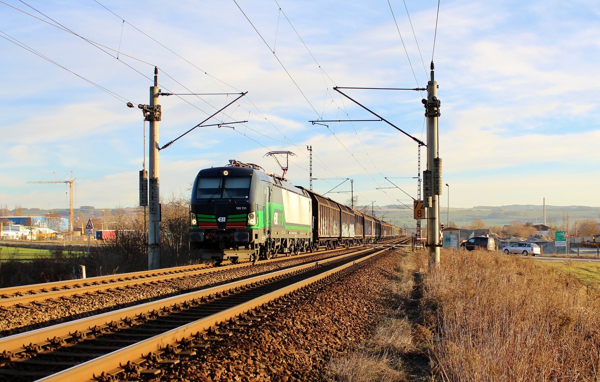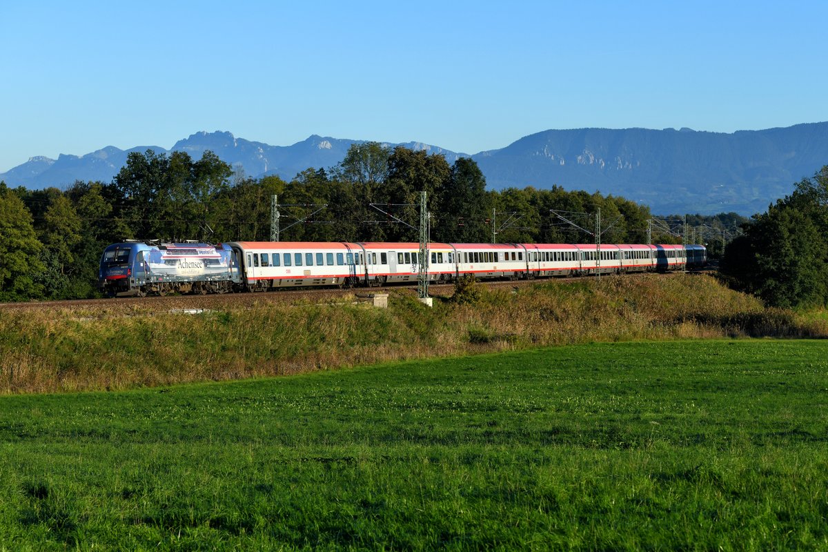 Der 27. September 2018 war ein ungewöhnlich klarer Tag. Daher bot es sich an, diesen bei Rann mit Blick auf die Kampenwand ausklingen zu lassen. Es kam auch bald eine attraktive Leistung vorbei, 193 777 von Lokomotion beförderte den DGS 41856 von Triest nach München Ost Rbf. Die Vectron-Maschinen sind inzwischen die Stamm-Loks vor dem sogenannten ekol-KLV.