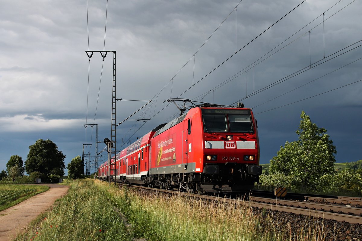 Am 06.06.2017 flieh 146 109-4 "Baden Württemberg erfahren/Lahr (Schwarzw)" mit ihrer RB (Offenburg - Neuenburg (Baden)) vor einem Gewitter, welches im Hintergrund zu erkennen ist, bei Müllheim (Baden) in Richtung Zielbahnhof.