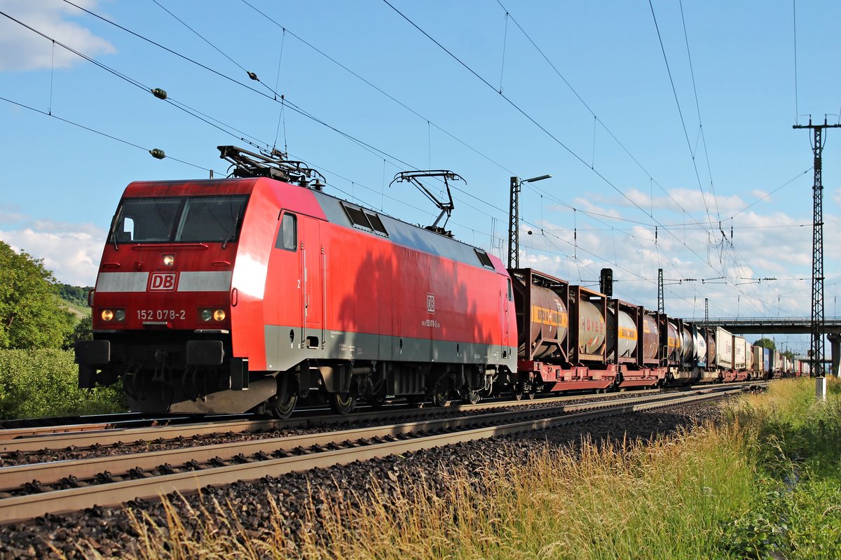 Am Nachmittag des 06.06.2017 fuhr 152 078-2 mit einem KLV (Weil am Rhein Ubf - Hamburg Billwerder) bei Müllheim (Baden) durchs Rheintal gen Freiburg (Breisgau).