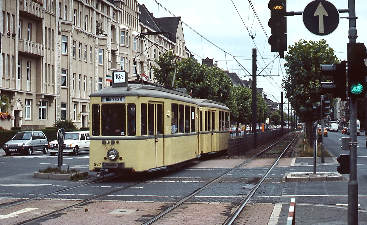 Anlässlich der Inbetriebnahme des U-Bahn-Tunnels zwischen Heinrich-Heine-Allee und Hauptbahnhof im August 1988 setzte die Rheinbahn zahlreiche Sonderzüge zwischen dem Düsseldorfer Hauptbahnhof und Oberkassel ein, darunter auch den Niederflurwagen 267, der hier als Linie 16/E auf der Luegallee unterwegs ist. Die Linie 16 verkehrte jahrzehntelang von Düsseldorf nach Neuss.