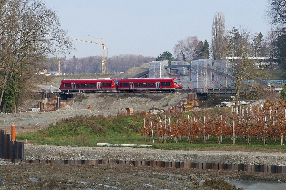 Baustelle Eisenbahnbrücke über die B31n (||) - Am 15.12.2018 ist bei Fischbach bereits die zukünftige Brücke teilweise zu erkennen, die neben der Bahnstrecke errichtet wird. Zwei Regio Shuttle fahren als RB 22772, Friedrichshafen - Radolfzell an der Baustelle vorbei.