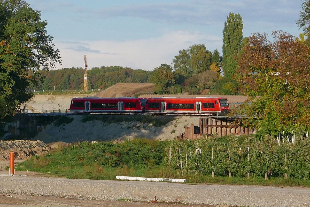 Baustelle Eisenbahnbrücke über die B31n (|) - Am 07.10.2018 befinden sich bei Fischbach zwei Regio Shuttle als RB 22780, Friedrichshafen - Radolfzell, zwischen zwei Behelfsbrücken, die später einmal die Widerlager für die Eisenbahnbrücke über eine vierspurige Bundesstraße sein werden.