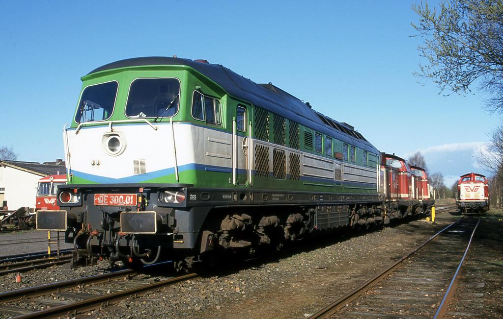 Betriebsstätte der EVB in Bremervörde am 13.4.2001: Großdiesellok DE 300.01 der Bahngesellschaft Waldhof ex DB 232103-2. Sie war frisch zur EVB gekommen und trug noch die Lackierung der Vorgesellschaft.