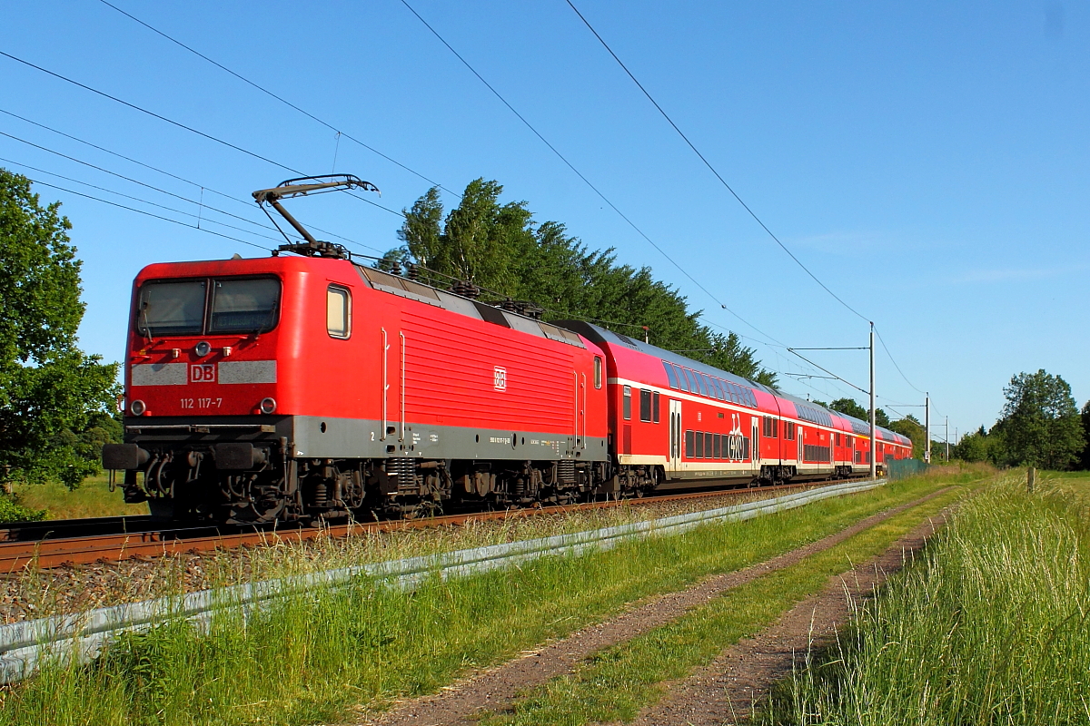 Die 112 117-7 schiebt am 20.05.2018 den RE 3515 von Stralsund Hbf nach Wünsdorf-Waldstadt durch Nassenheide.