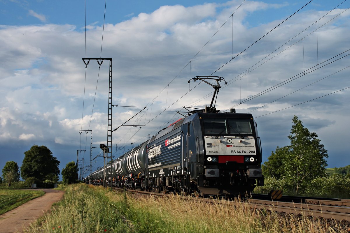 Mit einem "Kerosin"-Kesselzug nach Glattburg (CH) fuhr am 06.06.2017 die MRCE/SBBCI ES 64 F4-284 (189 284-3) "Alpäzähmer" bei Müllheim (Baden) in Richtung Schweizer Grenze.
