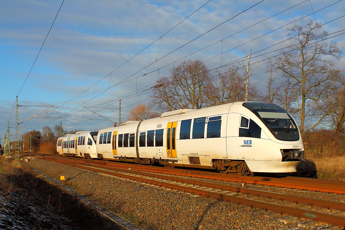 Nachschuss auf den VT 643.01 und VT 643.02 der NEB auf der Fahrt von Berlin Ostkreuz nach Templin Stadt am 18.01.2019durch Nassenheide.