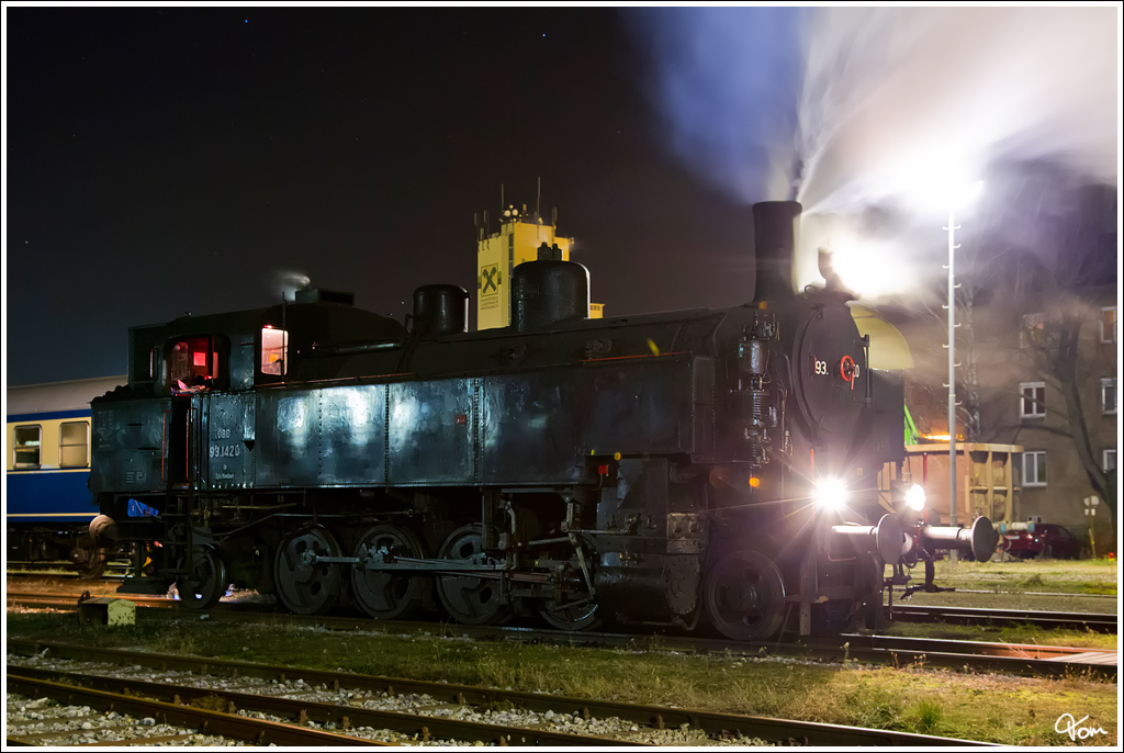 Nachtaufnahme der Dampflok 93.1420 am Abend des 8.12.2012 im Bahnhof Mistelbach.