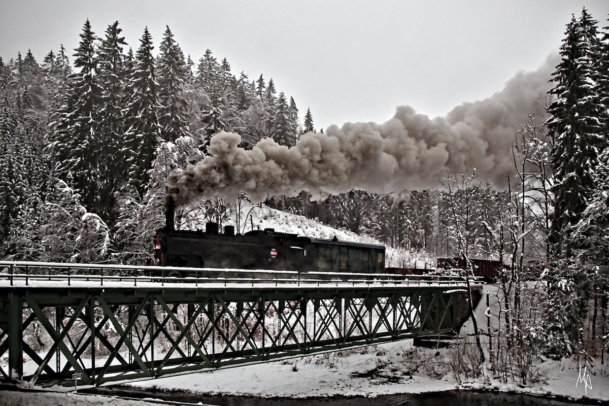 SZ Dampflok 33-037 fährt mit einem Weihnachtszug von Novo Mesto nach Metlinka, hier bei der Querung des Rundbogen-Viadukts in Otovec.