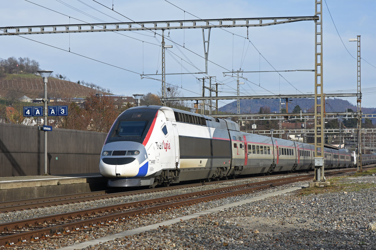 TGV Lyria 4403 durchfährt den Bahnhof Gelterkinden. Die Aufnahme stammt vom 16.01.2019.