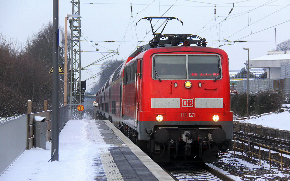 111 121 DB kommt die Kohlscheider-Rampe hoch aus Richtung Neuss,Herzogenrath mit dem RE4 aus Dortmund-Hbf nach Aachen-Hbf und fährt durch Kohlscheid in Richtung Richterich,Laurensberg,Aachen-West,Aachen-Schanz,Aachen-Hbf. Aufgenommen vom Bahnsteig 2 in Kohlscheid. Bei schönem Sonnenschein und Schnee am Kalten Nachmittag vom 23.1.2019.