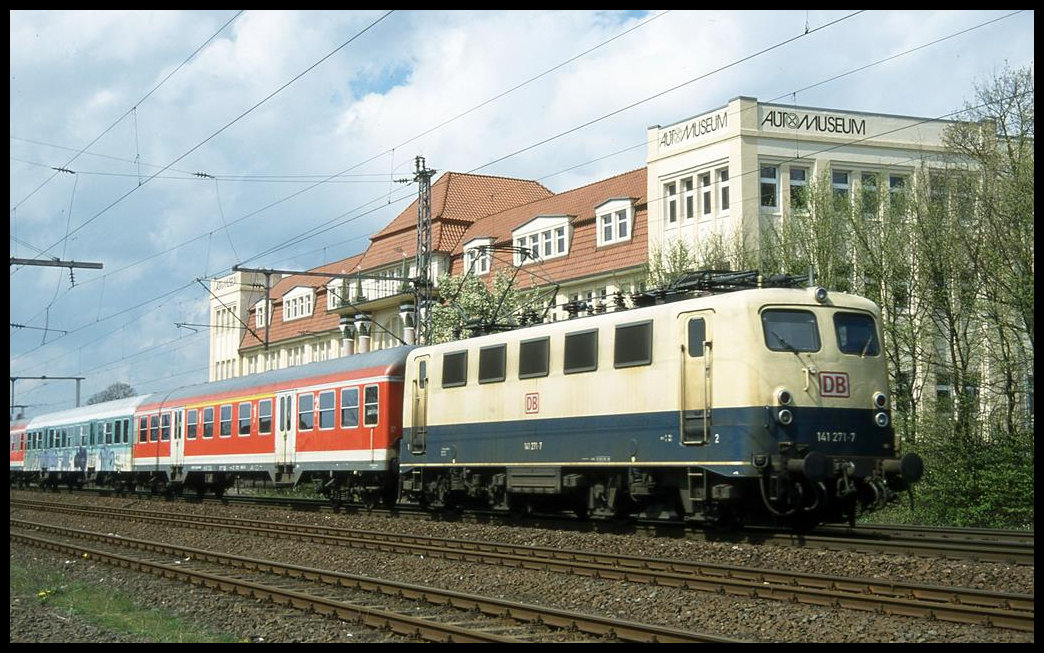 141326 erreicht hier mit einem RB aus Osnabrück kommend am 29.04.2001 um 12.04 Uhr den Bahnhof Melle. Im Hintergrund das Automuseum in Melle, welches früher mal eine Möbelfabrik war.