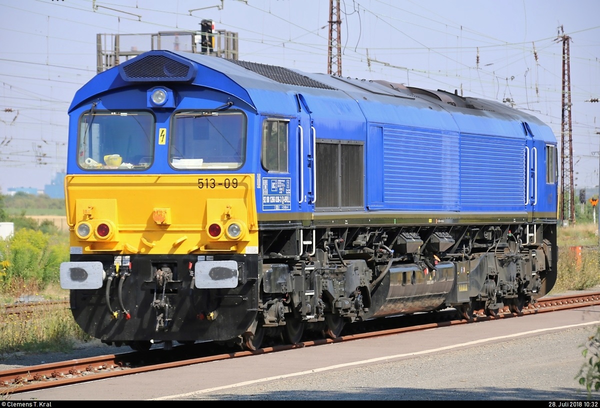 513-09 (92 80 1266 036-3 D-BRLL | EMD JT42CWR) der Beacon Rail Leasing Ltd., vermietet an CTL Logistics, ist im Bahnhof Großkorbetha abgestellt. Standort bis dorthin öffentlich zugänglich. Koordinaten: 51°16'09.9"N 12°01'20.0"E [28.7.2018 | 10:32 Uhr]