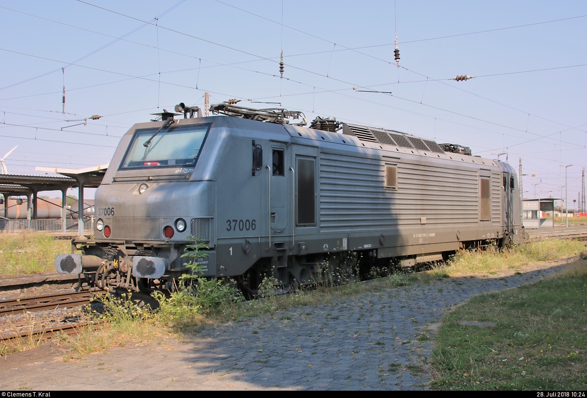 BB 37006 (91 87 0037 006-0 F-AKIEM | Alstom Prima EL3U/4) der Akiem S.A.S., vermietet an die Captrain Deutschland GmbH, ist im Bahnhof Großkorbetha am Hausbahnsteig abgestellt. Aufgenommen von der Straße Am Bahnhof. Standort öffentlich zugänglich. Koordinaten: 51°16'00.8"N 12°01'22.4"E [28.7.2018 | 10:24 Uhr]