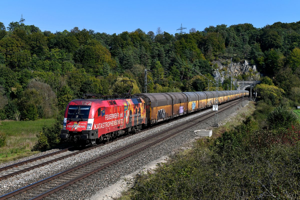 Bei der Ausfahrt aus dem Esslinger Tunnel konnte ich am 28. September 2018 die 1016.048 mit dem DGS 59760 von München Milbertshofen nach Bremen Rbf fotografieren. Die Lok mit ihrer auffälligen Werbung für den niederösterreichischen Feuerwehrverband ist aktuell praktisch nur noch innerdeutsch für RCC vor Autotransportzügen zwischen Süddeutschland und den Nordseehäfen unterwegs.