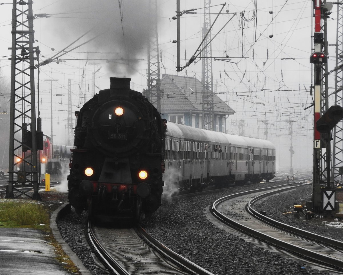 DAMPFLOK 58311 der EF TREYSA BEI EINFAHRT IM BAHNHOF DILLENBURG/HESSEN Am 26.1.2018 erreicht überaus pünktlich Dampflok 58311 der EF-TREYSA auf Sonderfahrt von TREYSA nach BETZDORF/BINDWEIDE gegen 10.00 Uhr den Bahnhof DILLENBURG/HESSEN bei ziemlicher "Nebelsuppe".....
