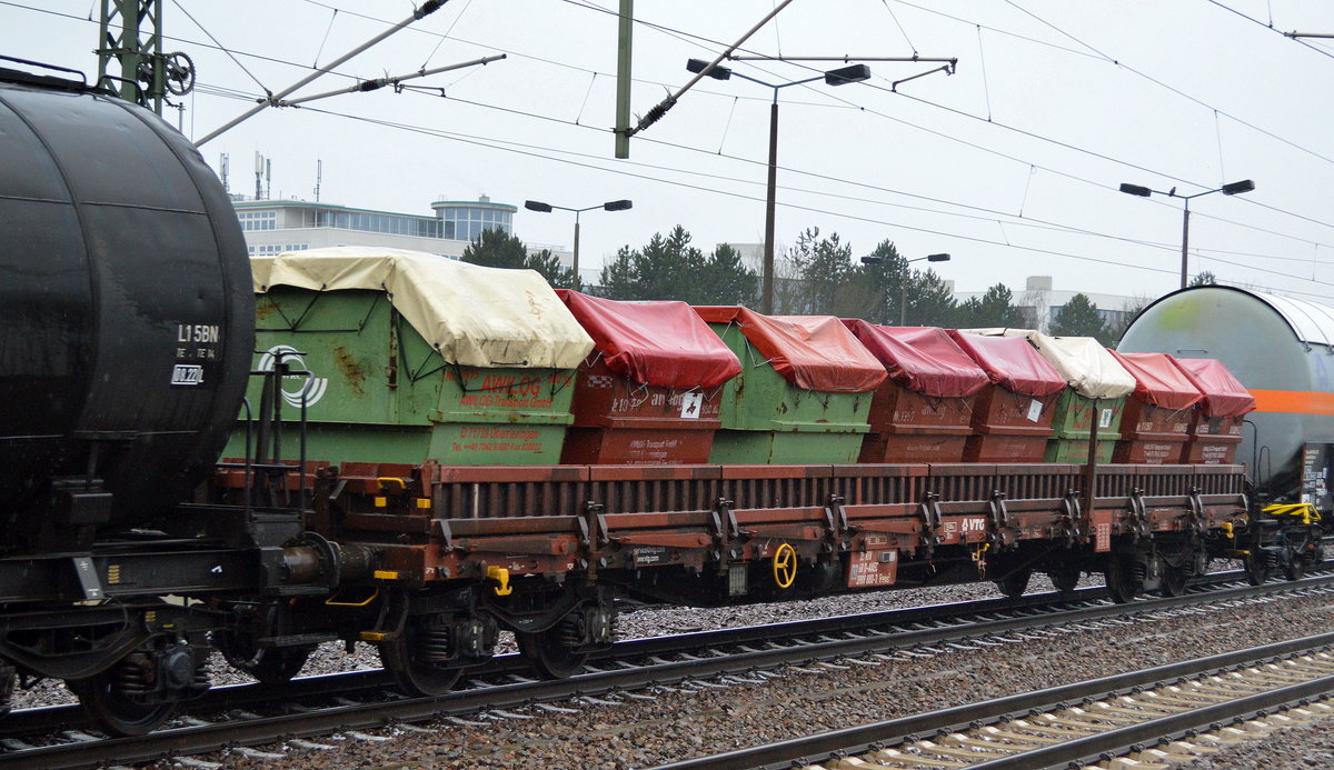 Drehgestell-Flachwagen vom Einsteller Ahaus Alstätter Eisenbahn Cargo AG (gehört zu VTG) mit der Nr. 35 RIV 68 D-AAEC 3988 880-3 Rens2 beladen mit LKW-Absetzcontainern mit Folie abgedeckt in einem gemischten Güterzug am 26.01.19 Bf. Flughafen Berlin-Schönefeld.
