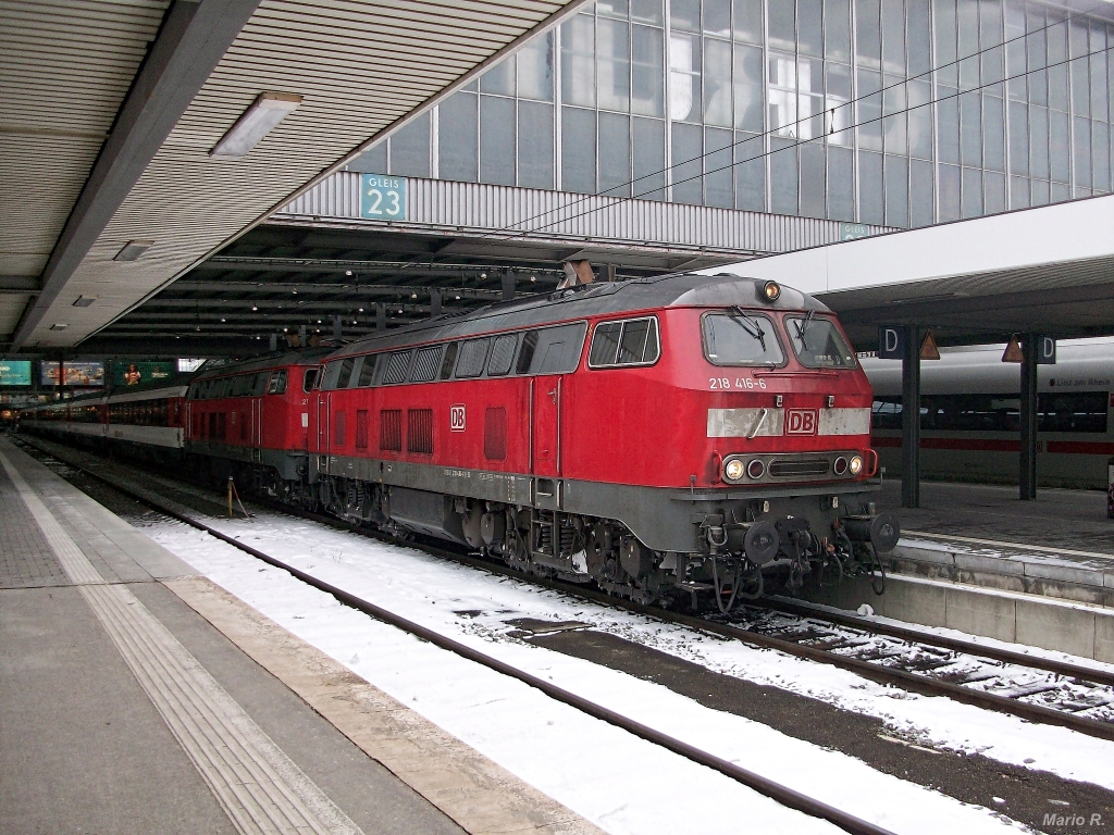 Eine der wenigen Leistungen im Fernverkehr in Bayern, die mit Dieselloks gefahren werden, ist der EC München-Zürich. Am 23.2.13 hatten 218 416 und 218 445 die Aufgabe, den Zug zu bespannen. Aufgenommen in München Hbf