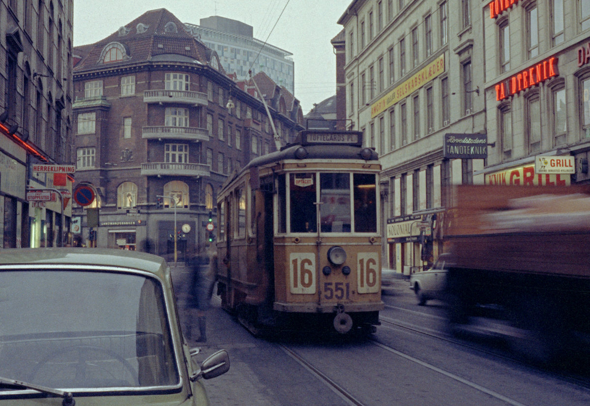 København / Kopenhagen Københavns Sporveje SL 16 (Tw 551) København V, Vesterbro, Gasværksvej / Vesterbros Torv / Vesterbrogade am 13. Februar 1970. - Scan eines Farbnegativs. Film: Kodak Kodacolor X.