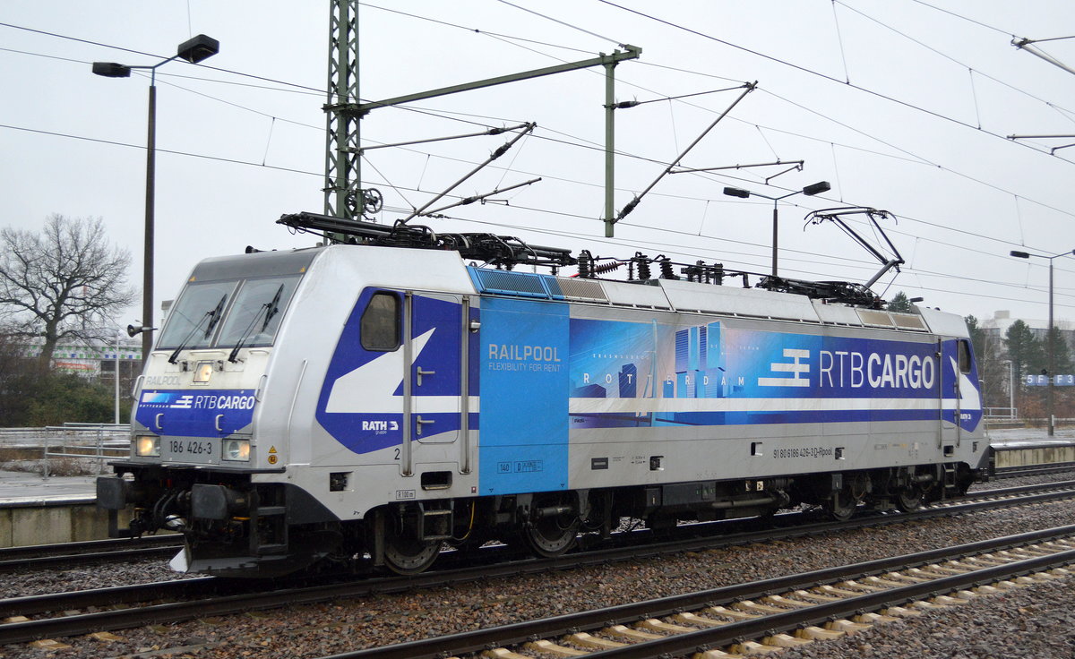 Lok-Portrait: Die RTB Cargo - Rurtalbahn Cargo GmbH mit einer von ihren wunderschön gestalteten Rpool-Loks, der "186 426-3" [NVR-Number: 91 80 6186 426-3 D-Rpool] bei der Durchfahrt Bf. Flughafen Berlin-Schönefeld, 26.01.19